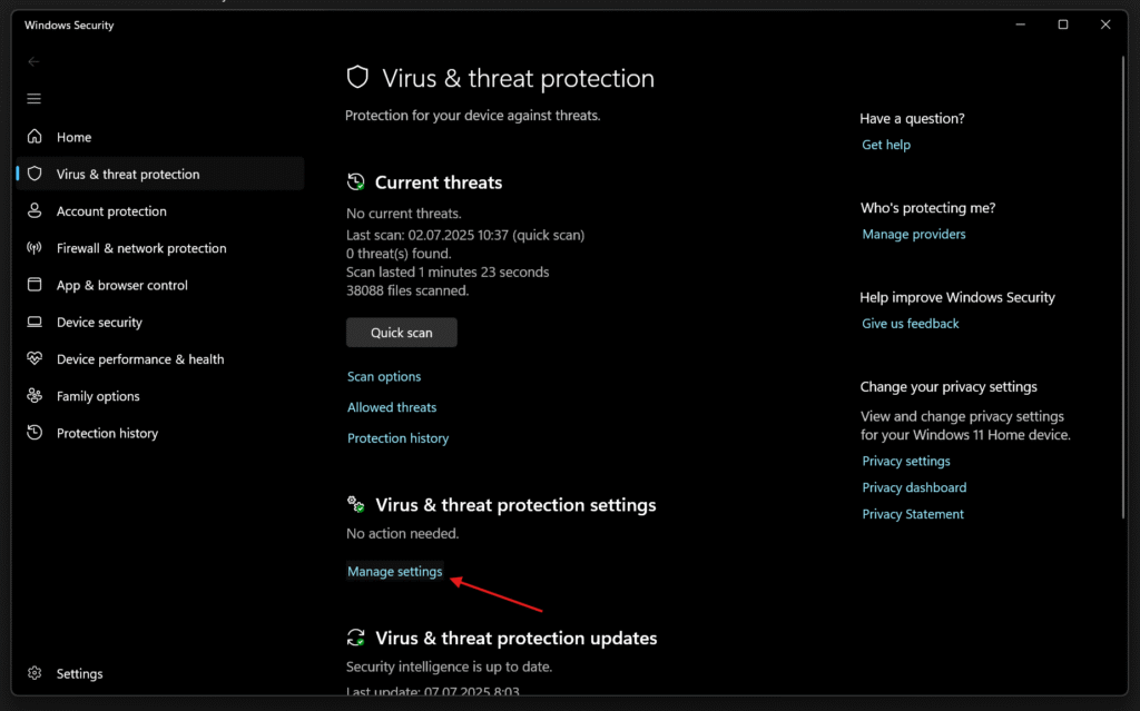 - Under Virus & threat protection settings, click Manage settings.